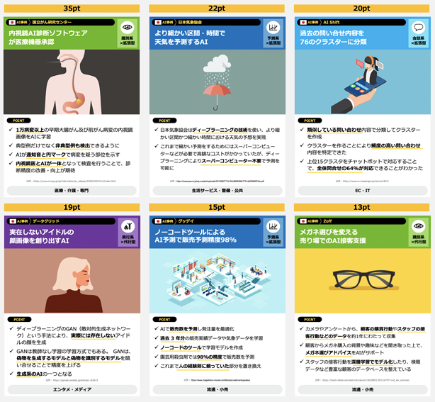 私も学びながら、製造数を予測するAIが浮かびました。店内加工が必要な生鮮食品について、売り場の残数がなくなってから製造するというのでは遅いので、AIが売り場の残数を検知し、そのデータから前もって必要な製造数を予測できるようになれば、常に売り場に品揃えが保てる状態になると思いました。自動発注の予測では客数予測も必要になるので、それとあわせてできそうですよね。