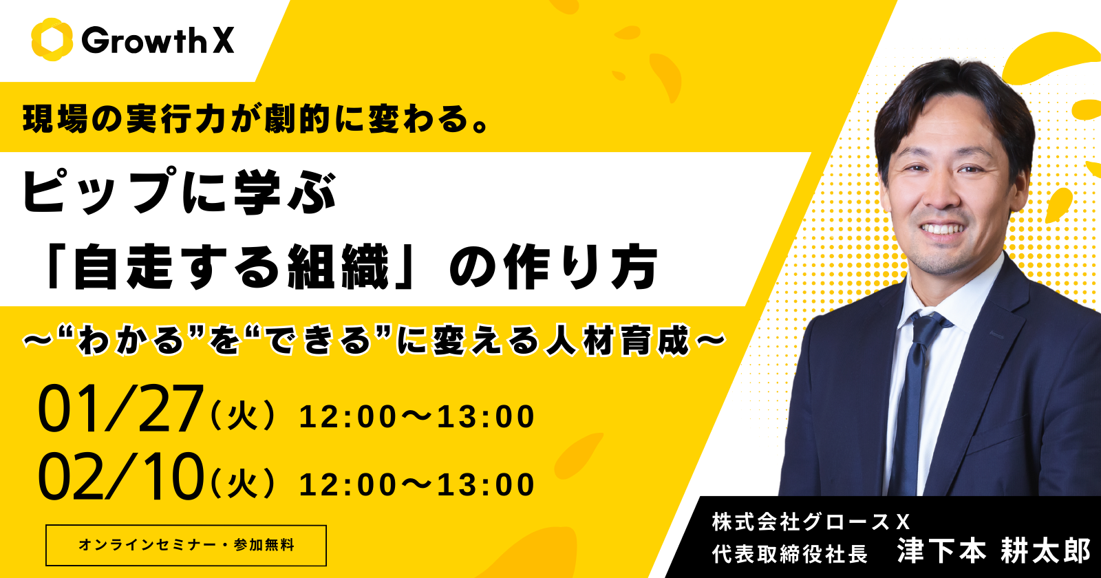 本セミナーでは、600社・2.5万人超の育成実績を持つグロースX代表・津下本が、導入企業様の実績から導き出された「“わかる”を“できる”に変える育成メソッド」を解説します。