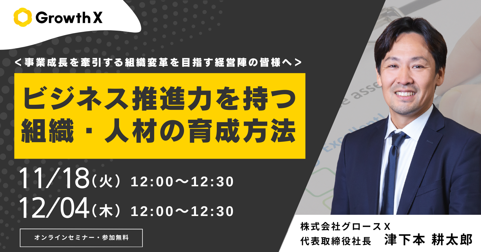 本セミナーでは、600社2.5万人超の育成実績を持つグロースXの代表・津下本が、社員一人ひとりが自信を持って事業を推進し、永続的な業績向上に繋げるための本質的な思考法と実践ノウハウを徹底解説します。