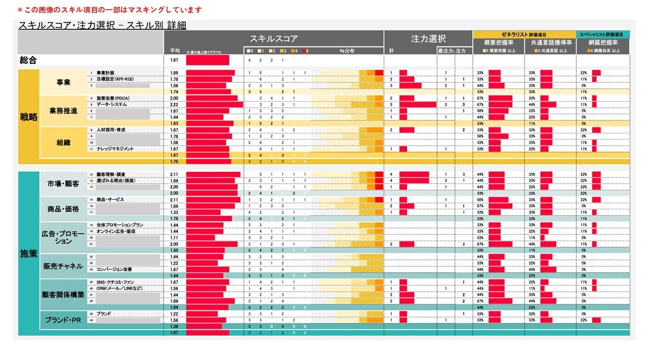 この診断により、個人のスキルレベルだけでなく、組織的な課題や現場の注力ポイントなど組織全体のマーケティング力の現状が可視化されます。