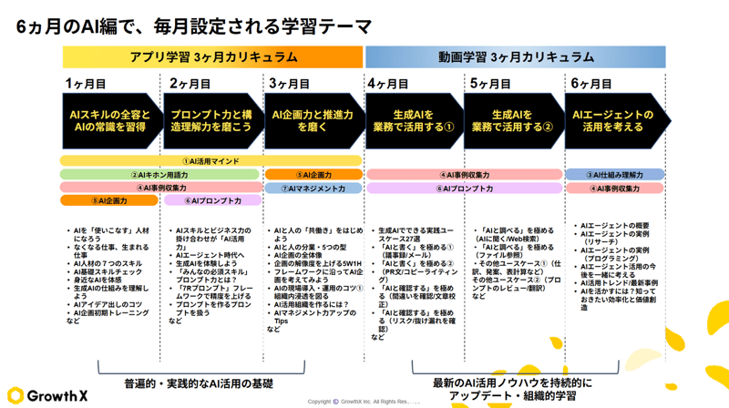 • 前半3か月:AI活用の基礎と業務転用の思考フレームを構築。”AIが進化しても、変わらない基礎知識”をわかりやすく学習