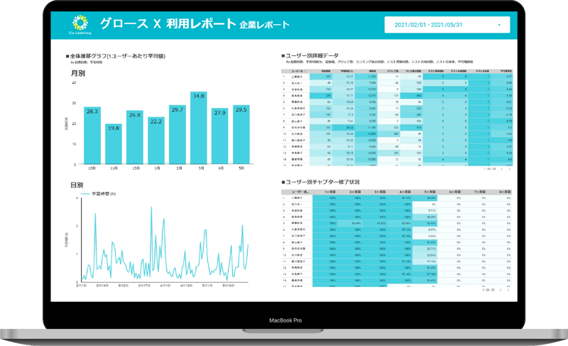また、管理者の方はダッシュボードでメンバーの進捗度合いや理解度を見て、学習アドバイスを行うことも可能です。