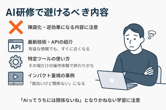 AI研修で避けるべき内容(=すぐに陳腐化・逆効果になりかねない)