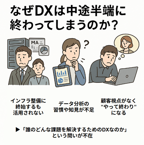 ツールやデータの整備が目的化してしまい、「誰のどんな課題を解決するためのDXなのか?」という問いが不在のまま、プロジェクトが進んでしまうのです。