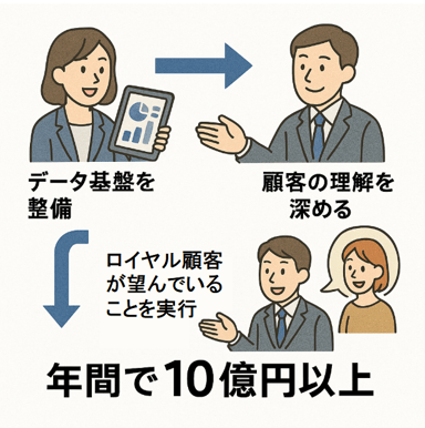 - 顧客データ基盤の統合と購買データ補足に基づくオムニチャネル・CRM施策により、年間の営業利益を10億円以上底上げ