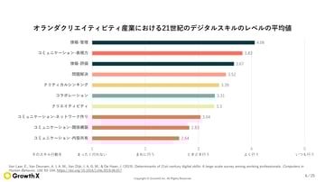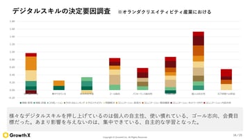 【無料ダウンロード】世界のクリエイティブ産業におけるデジタルスキル実態調査 株式会社グロースXは、リスキリングを調査した国外の文献を調査し、デジタルスキル(インターネットやPC、スマホなどのデバイスを適切に使いこなすスキル)を押し上げる要因についてまとめました。 その結果、「とにかく慣れる」「習慣化する」など定期的なデジタルとの接触と、自主性(ただし周囲の目などの「本人が動かざる得ない動機と環境をつくること」)が、デジタルスキルを押し上げると分かりました。 リスキリングは「ツールは用意したので後はどうぞ」だけでは組織内に浸透せず、組織を巻き込んだ仕組みを作って習慣化を提供することが大事であることが伺えます。 無料でダウンロードしていただけますので、ぜひご活用ください。(PDF形式・全25ページ) <調査結果資料より一部抜粋>
